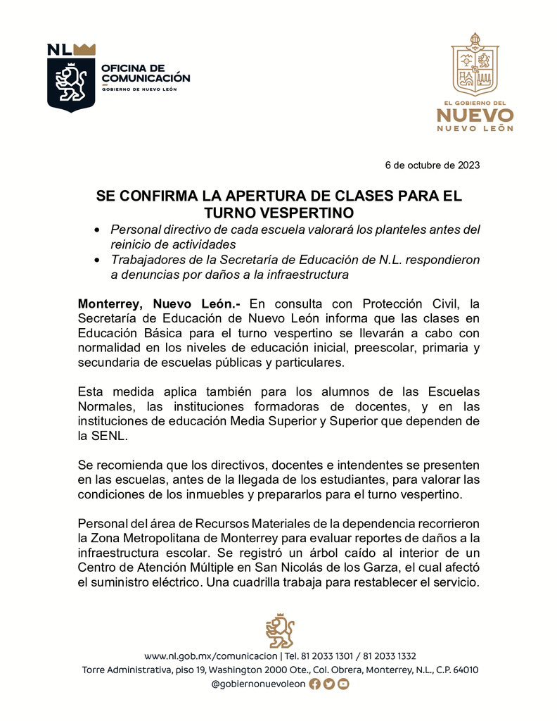 Ver másLa Secretaría de Educación de Nuevo León ha confirmado que las clases en el turno vespertino de Educación Básica se…